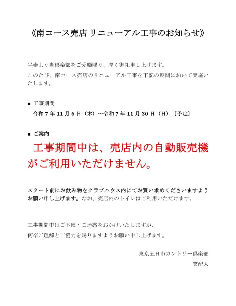 南コース売店 リニューアル工事のお知らせ